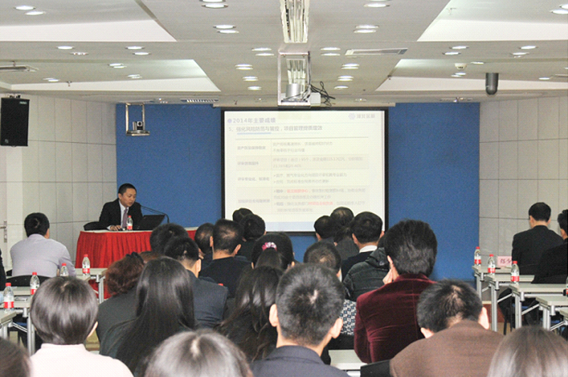 張總裁在會議上做了2014年年度工作報告及2015年工作安排,全面客觀地回顧了一年來公司各項工作進展情況,發現問題,總結得失,并根據戰略規劃部署了新一年重點工作任務。2014年是公司進行戰略轉型的第一年,在“抓住機遇、提質增效”的指導思想下,圍繞抓好融資結構升級和風控手段創新兩個著力點,加快干部隊伍建設梯隊化和年輕化步伐,構建了“業務行業化、融資多元化、風控專業化”的經營新格局。